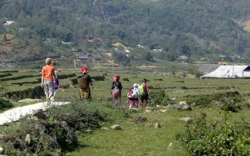 We start 3km of walking down to the south east of Sapa along the side of Muong Hoa valley to Y Linh Ho village of the Black H’mong - visit local school and local houses then continue 4km of trekking down to Lao Chai village of the H’mong.