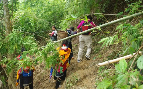 9.30 We will trek on a hilly trail around 3 km throught Bamboo forest to Giang Ta Chai village where you can see the Red dao minority people. You can make a stop at a waterfall for taking the photos. Have soft break at rattan bridge –the oldest rattan bridge in Sapa. Visit some house and continue to go to Su Pan village . Have lunch at the village