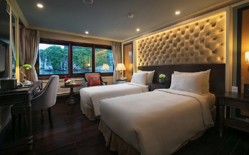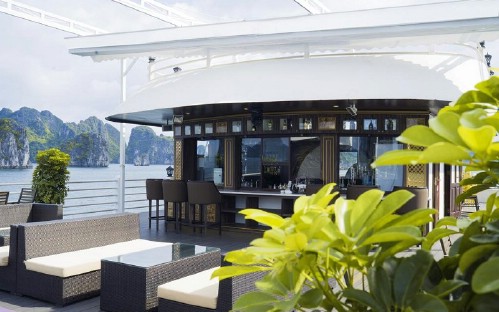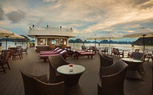 The Athena Cruise is the brand new five-star luxury cruise vessel in Ha Long Bay – Bai Tu Long Bay.  Built in 2016, the Athena Cruise made her maiden voyage on July 1st, 2017.  The ship has 3 decks: a lower deck with reception, cabins, and boarding area, a middle deck with cabins, an indoor restaurant and bar, and a rooftop sundeck with open bar, coffee lounge, spa and sauna.  On board the Athena Cruise there are 21 high-end cabins with 5 different styles available to custom-tailor your voyage with us.