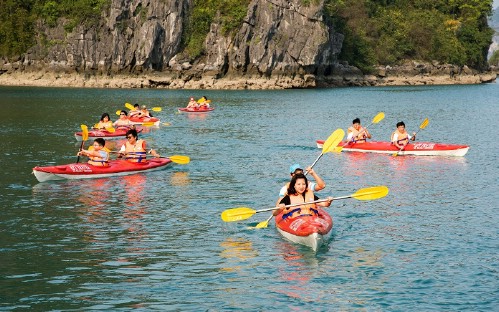 15:00:  You at  Tung Gau Area. The airy and fresh air, cool breezes, blue sea and sky, and natural seascape will captivate any visitors setting foot here. Especially, Tung Gau of Lan Ha Bay is extremely suitable for enjoying kayaking and swiming and then Visiting Halong Pearl Farm Village