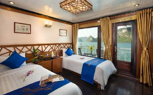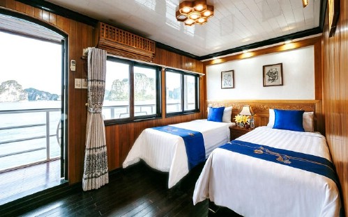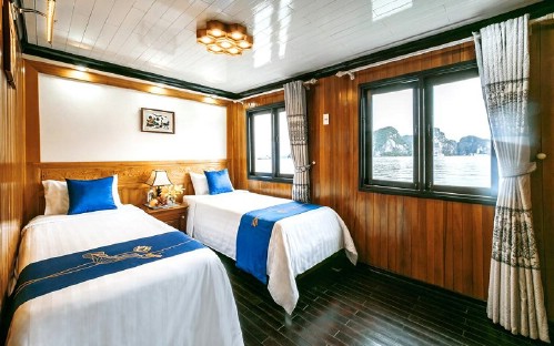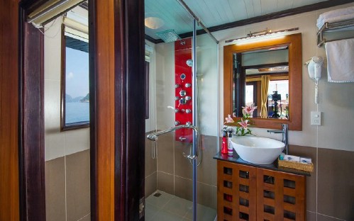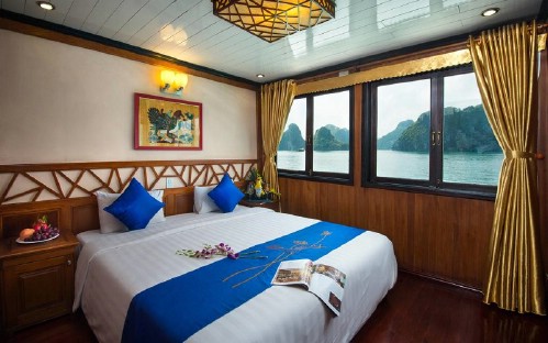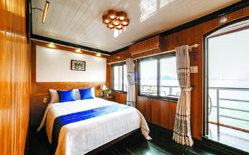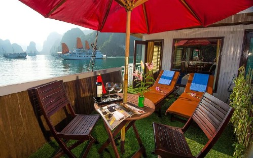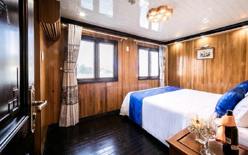 GRAY LINE HALONG is one of the latest wooden cruises in Halong Bay. The group of 2 unique Scorpion-shaped boats standing out in the bay, features the same floor plan spreading over 3 main decks, in which, the 1st deck is for accommodation only, the second is for cabins with balcony or terrace and restaurant as well; and the upper deck is for sunbathing and open-air bar. They cozily offer boutique interiors with oak-wooden walls, where all cabins and en-suites have openable oversized sea-view windows.