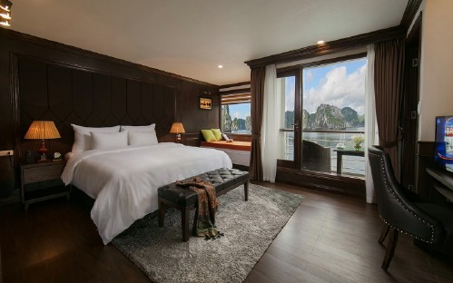 • 12:00: Embark Mon Chéri Cruises. You will be served a welcome drink and provided with a cold towel. This will be followed by a cruise briefing where you will also be given safety instructions before checking in to your cabin. We will set sail and you will have lunch in Mon Cheri's luxury restaurant while enjoying the beauty of the canals on our way to Halong Bay.