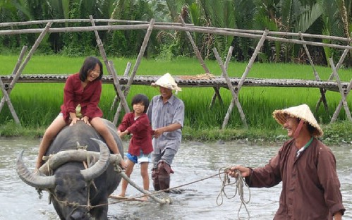 • Starting farming work like plough and raking with buffalo, riding water buffalo, learning how to transplant rice, flooding farm, grinding rice, pounding rice.